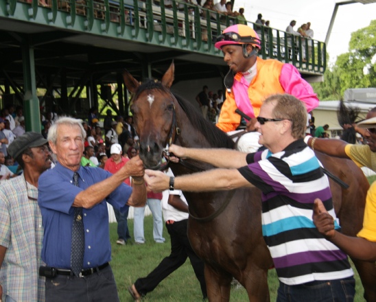 Sir Charles Williams (in blue shirt at left) leading in victorious Derby winner Bandera Belle with trainer Andrew Nunes. Jockey Renaldo Cumberbatch is astride the filly